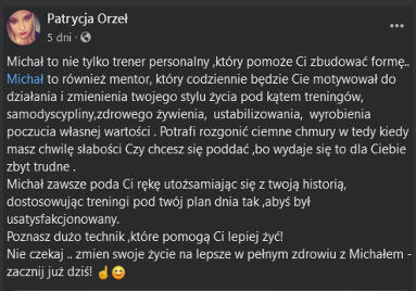 Przez ostatnie 8 lat prowadziłem setki osób uzyskując topowe efekty, a każda jedna osoba, by je uzyskać poświęcała wyłącznie 20 minut 2-3 razy w tygodniu.Jeśli od dawna myślisz by coś ze sobą zrobić ale brakuje Ci na to czasu- pokażę Ci, że nie musisz spędzać godzin na siłowni by uzyskać wymarzoną sylwetkę